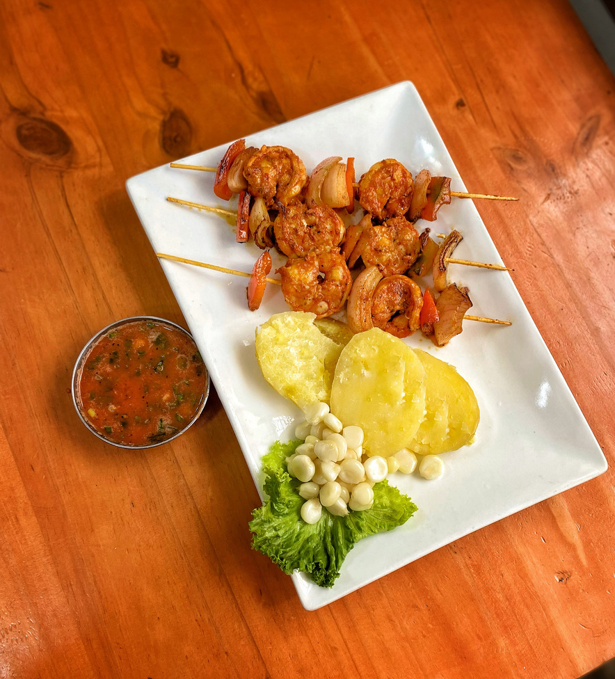 Langostinos marinados con salsa de anticucho casera, hecho con sabor y sazón.