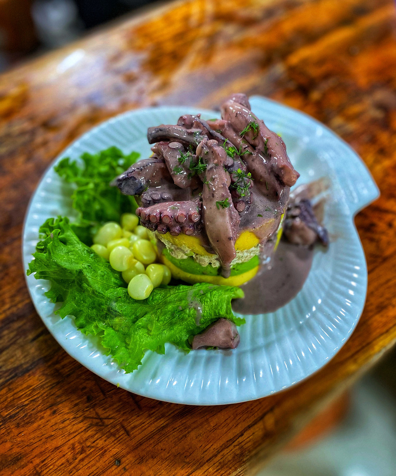Causa rellena de pulpa de pescado y palta, marinado con pulpo en salsa al olivo.