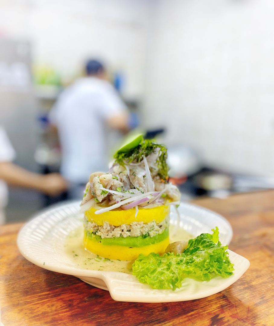 Causa de pescado con un ceviche al gusto del cliente.