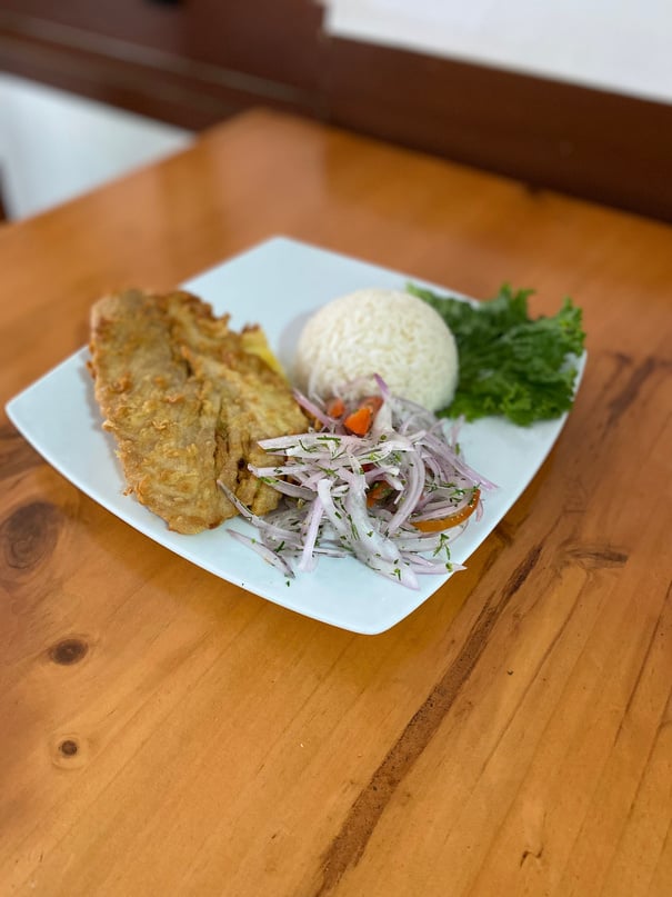 Filete de pescado que va acompañado de yucas fritas, ensalada y arroz.