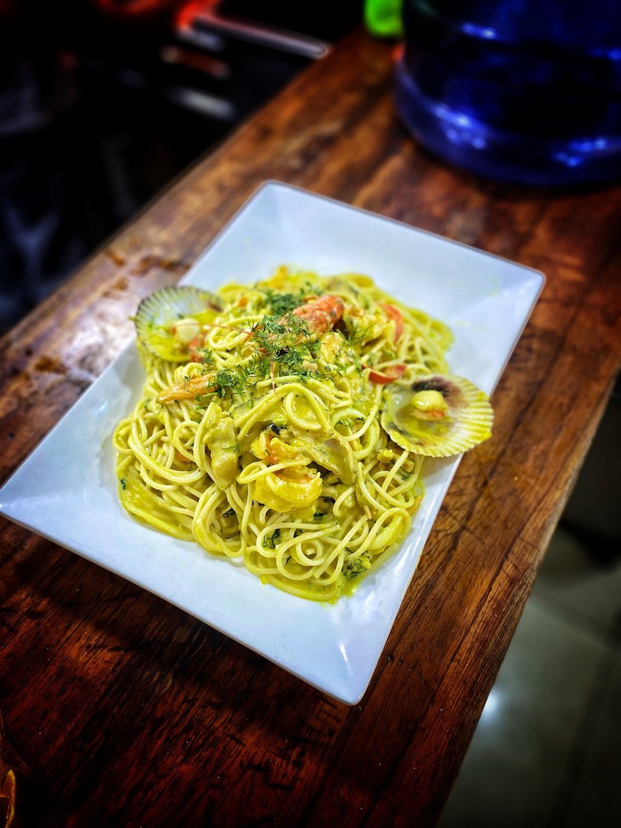 Tallarines con mariscos marinados con una salsa cremosa al estilo a lo Alfredo pero con su toque de Ají amarillo.